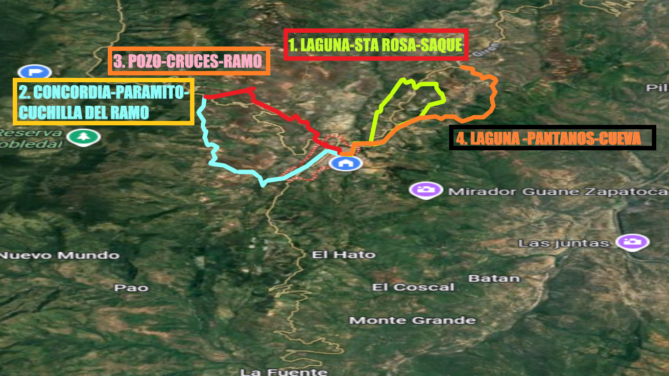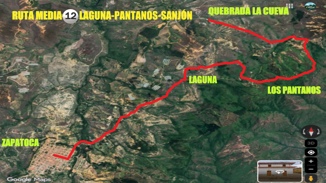 Recorrido: Parque Principal, Camino Empedrado hacia la Laguna del Sapo, ascenso a los Pantanos Altos, Mirador de los Pantanos, quebrada La Cueva, retorno por senderos tradicionales.