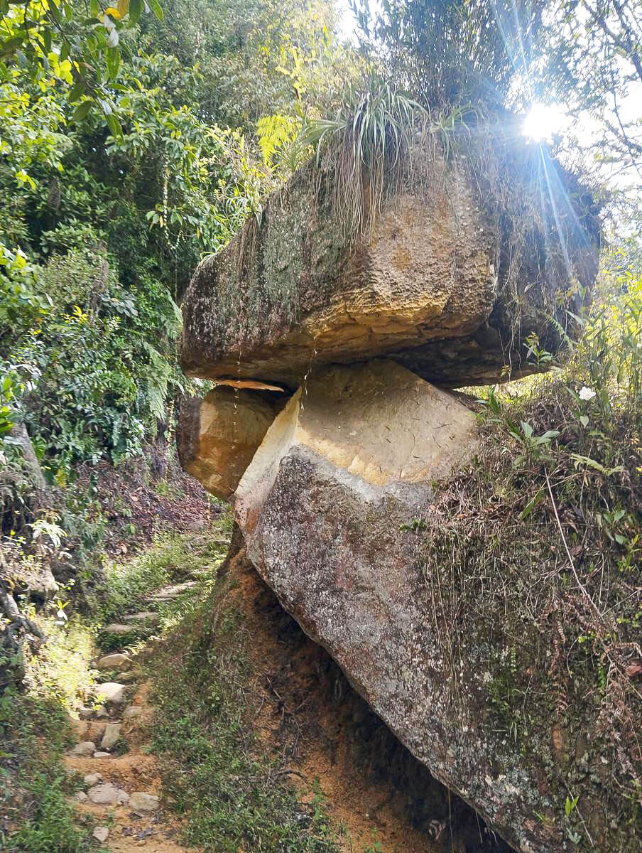 La ruta comienza en el parque de Guadalupe, dirigiéndose hacia el sur hasta encontrar el camino que lleva a Las Gachas. Antes de llegar al balneario, tomamos un desvío a la izquierda por los potreros para llegar a la cascada El Chorro. Luego, regresamos a los potreros y continuamos hacia la derecha para encontrar el camino ancestral conocido como la Ruta de la Sal a Zipaquirá, por donde pasó Simón Bolívar. En este lugar se encuentra la Piedra del Diablo y una pequeña cueva llena de mitos y leyendas. Continuamos el recorrido pasando por la finca de Luis Fernando Díaz, y al salir, encontramos nuevamente el sendero de Las Gachas, donde se puede encargar el almuerzo. Más adelante, llegamos al balneario Las Gachas y seguimos el sendero hasta regresar al parque de Guadalupe.