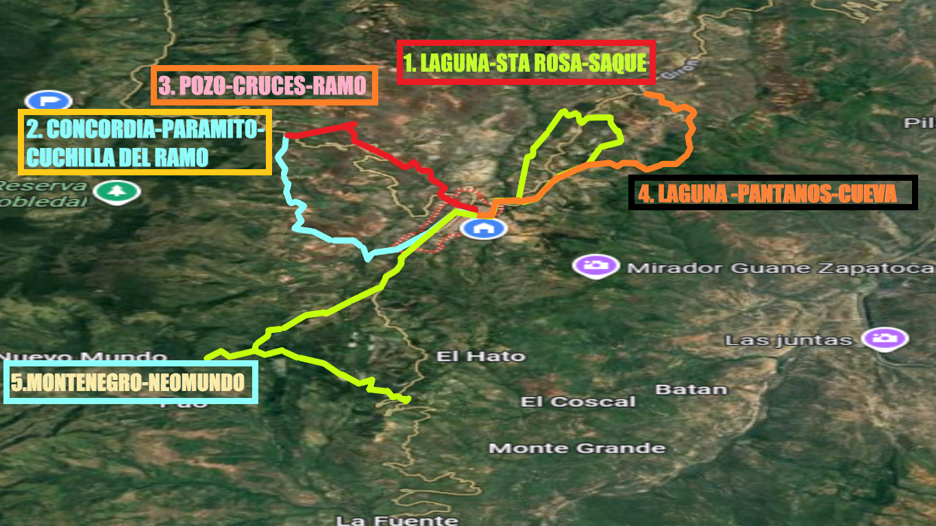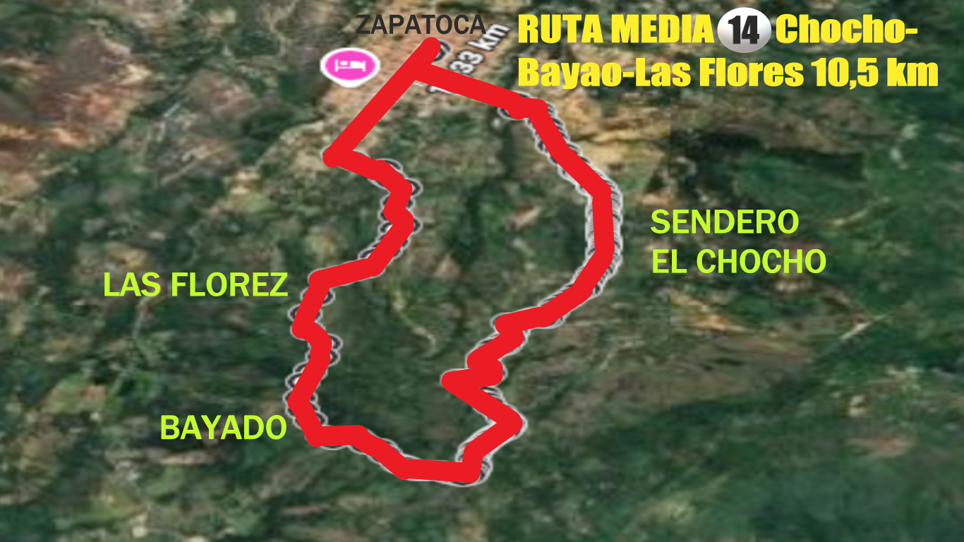 La ruta inicia en el Parque Principal y continúa hacia la urbanización La Alsacia, donde es posible apreciar una amplia zona kárstica, reconocida por sus formaciones geológicas singulares. Luego tomamos el camino al Chocho —nombre que honra a un árbol nativo de la región— y ascendemos por el sector del Vallado para enlazar con el histórico Camino de Lengerke proveniente de Guane. El recorrido avanza cerca de la Hacienda Las Flores y finalmente desciende hasta conectar nuevamente con el perímetro urbano de Zapatoca, completando una travesía que combina naturaleza, historia y paisajes rurales.